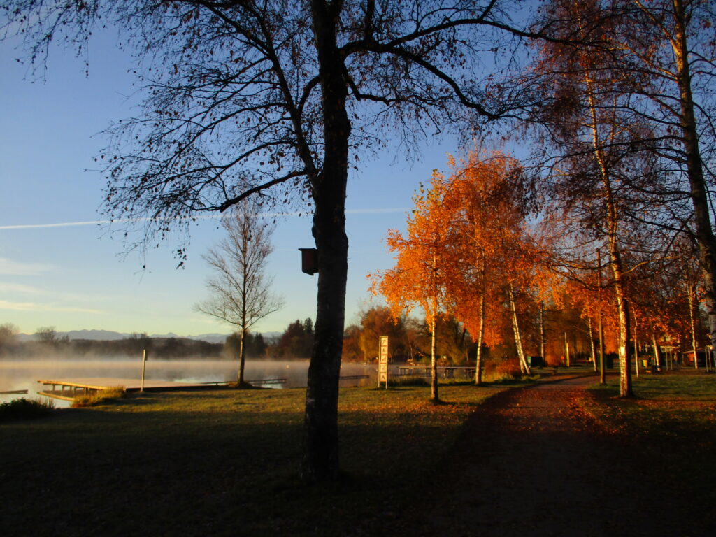 湖水から水蒸気が上がる。朝日を浴びて木の葉が赤く染まる。