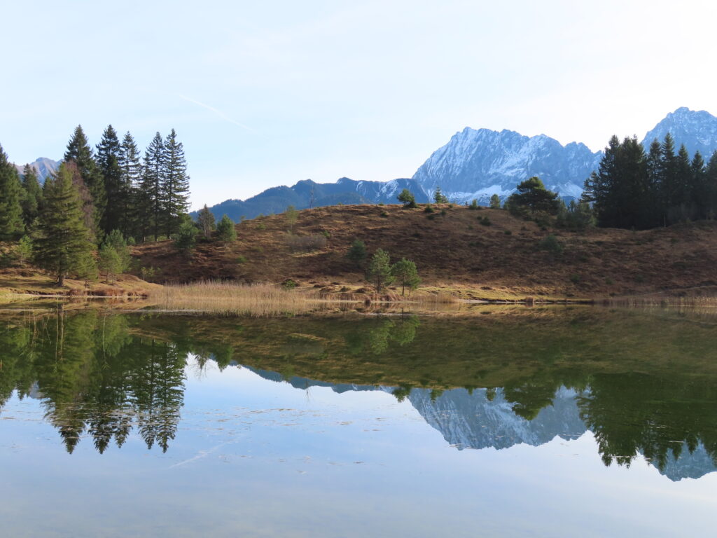湖面は鏡のように風景を反射して。風もなくとても静か。
