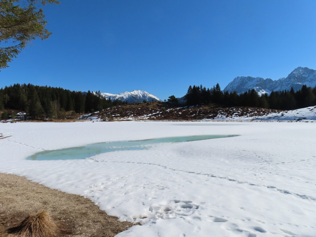 湖が雪原のよう。ただ水量が少ないのが明らか。この夏は干上がるかもしれない。