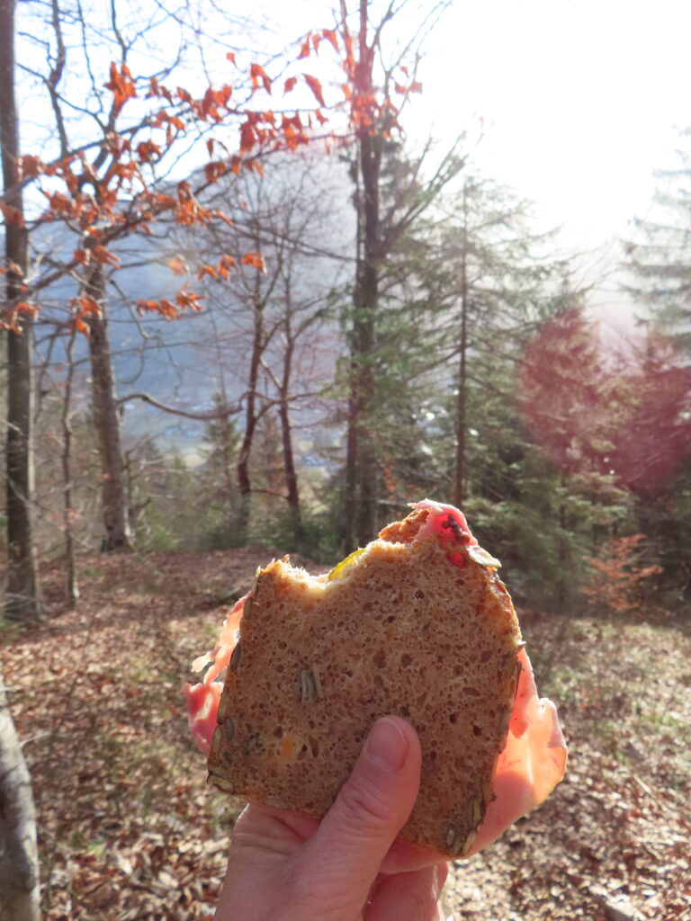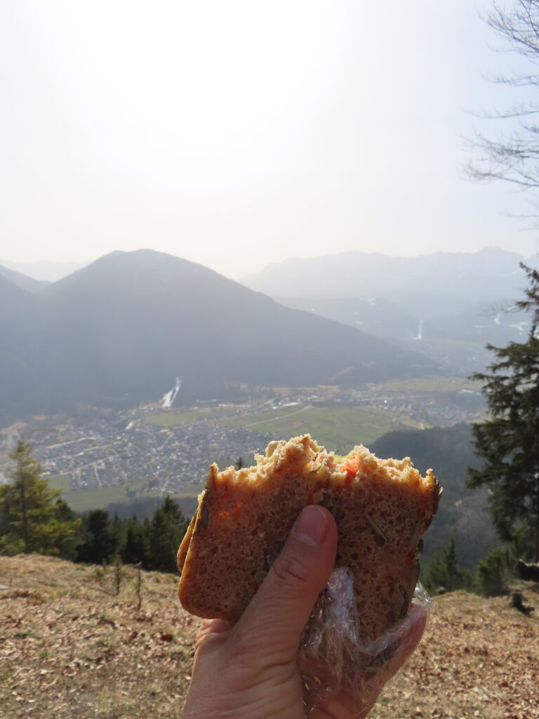 頂上で二つ目のサンドイッチ。このところ空気質が悪い。朝のうちはまだ山がよく見えてたのに。気温が上がっているためもあるのだろうか。