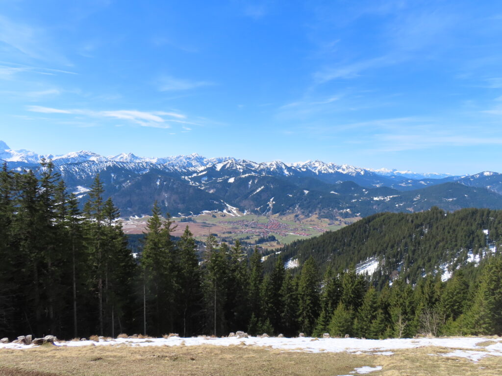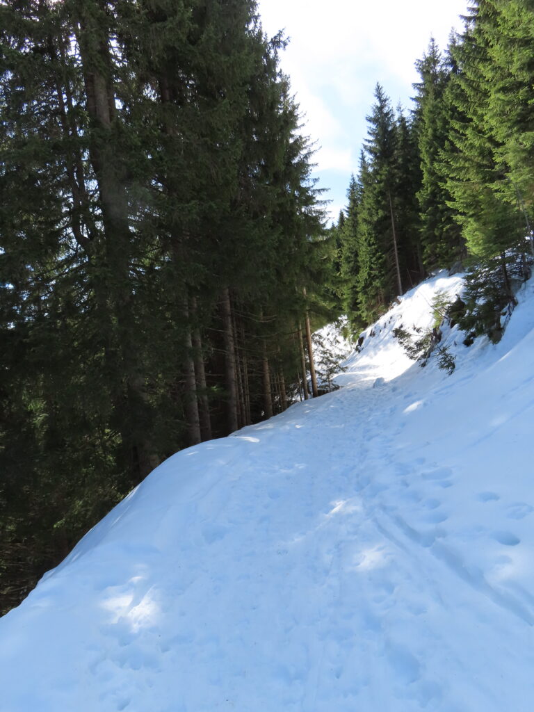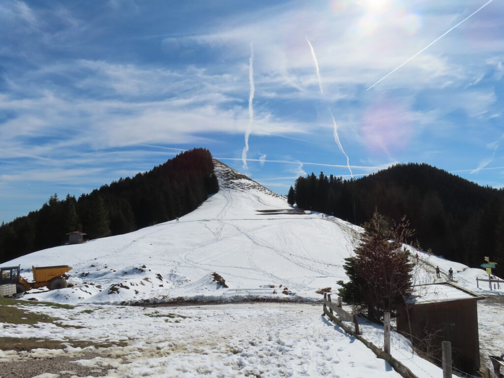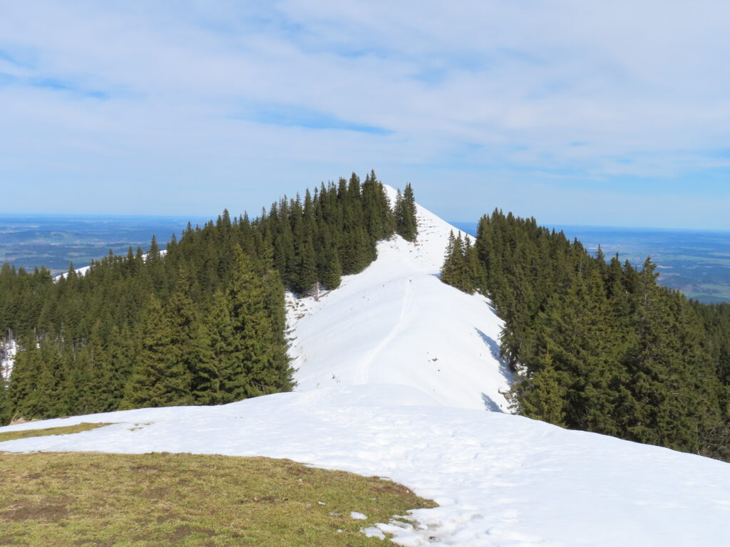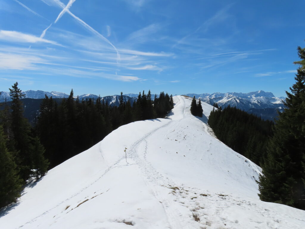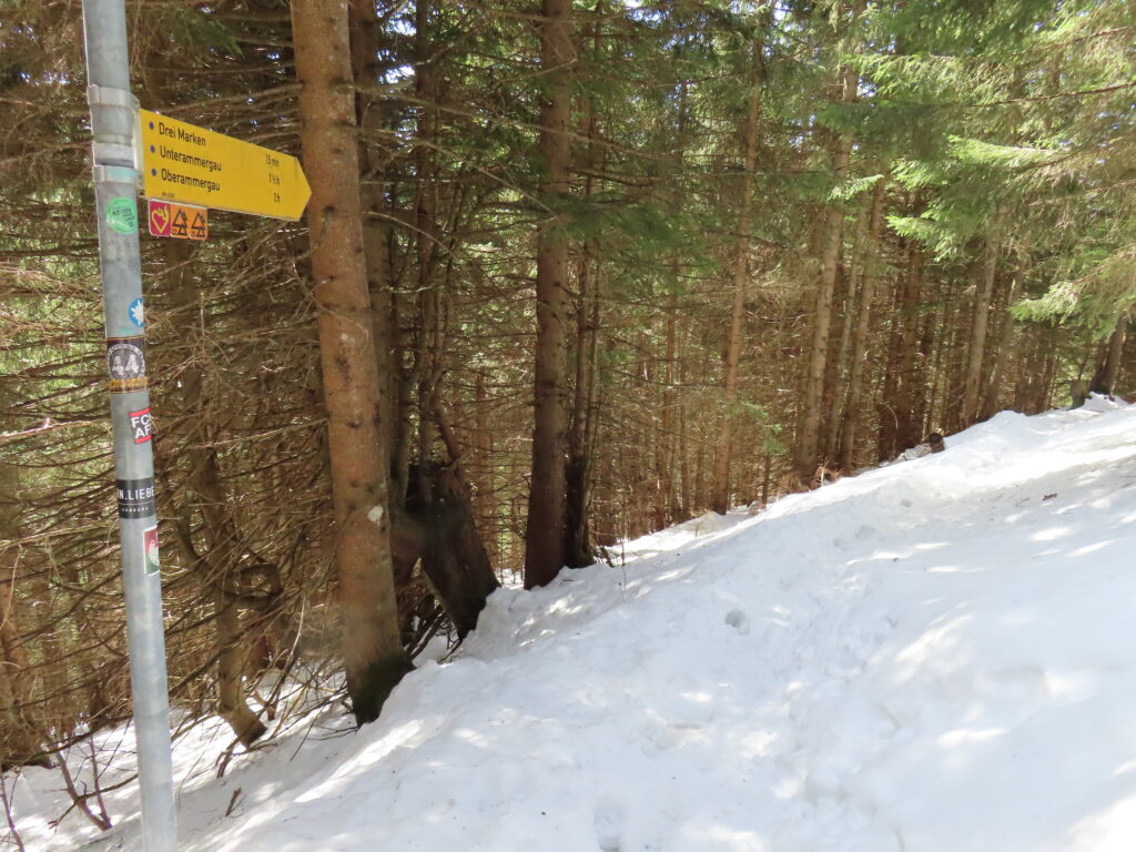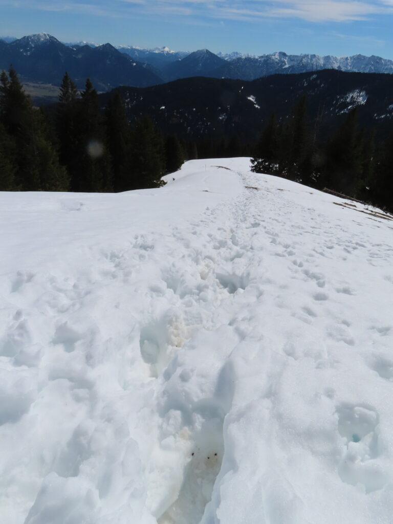 雪さえなければ楽勝の道なのだけど、思ったよりしんどい。いつもはこの写真の左側の「後ろのヘルンレ」に登った後に右側のスティアコプフまで歩き、その後アマガウに降りるのだけど、道がどうなっているかわからない。