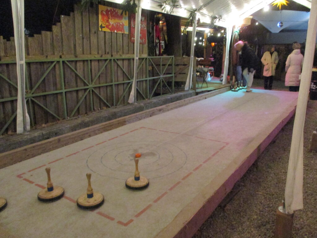 アイスストックという、カーリングに似た遊び。普通は氷上でやるのだが、地球温暖化に伴い、環境にやさしく木製のバーンを使うところが増えているそうだ。