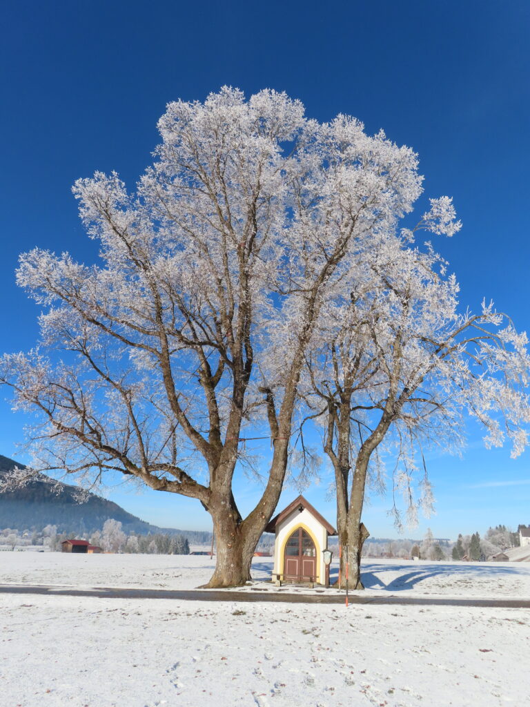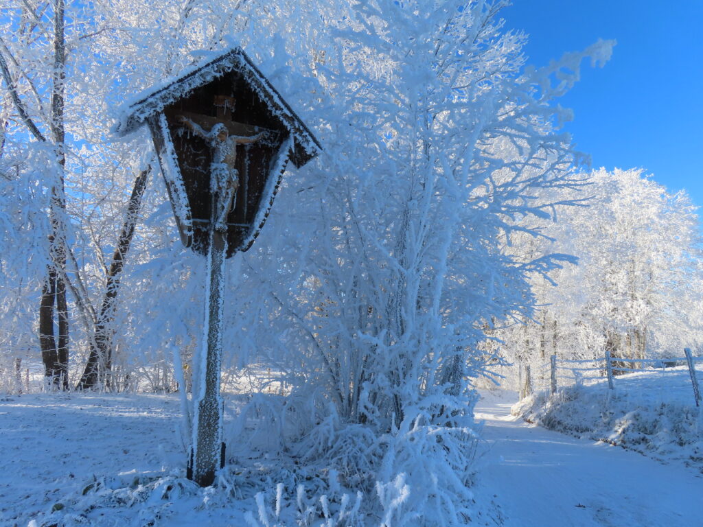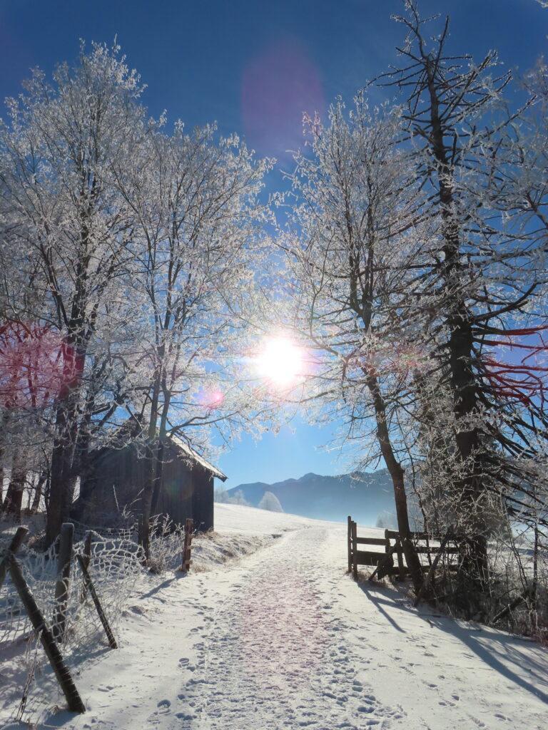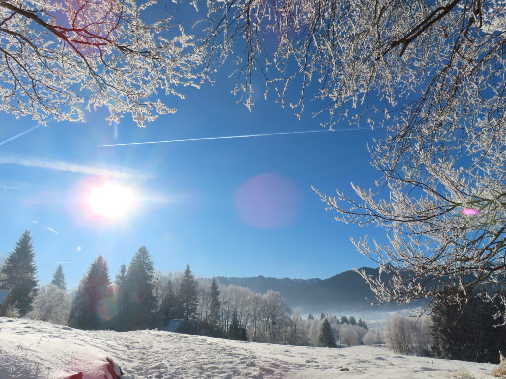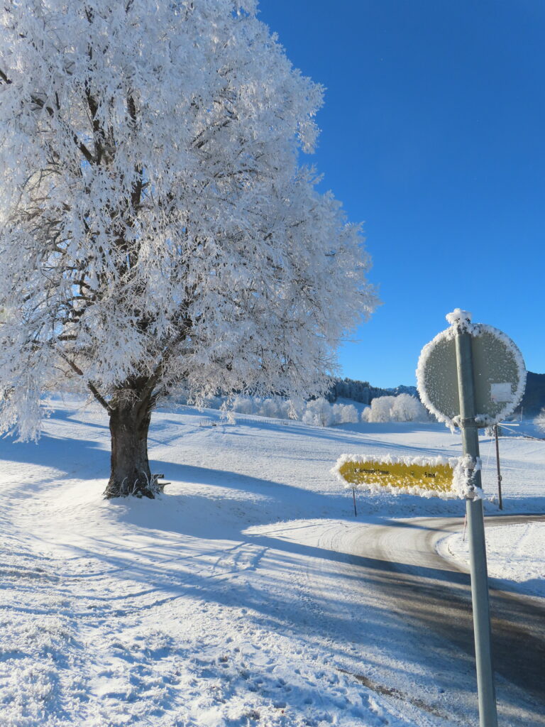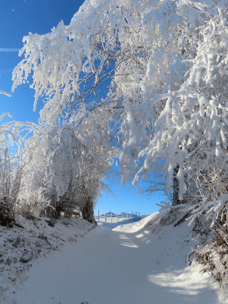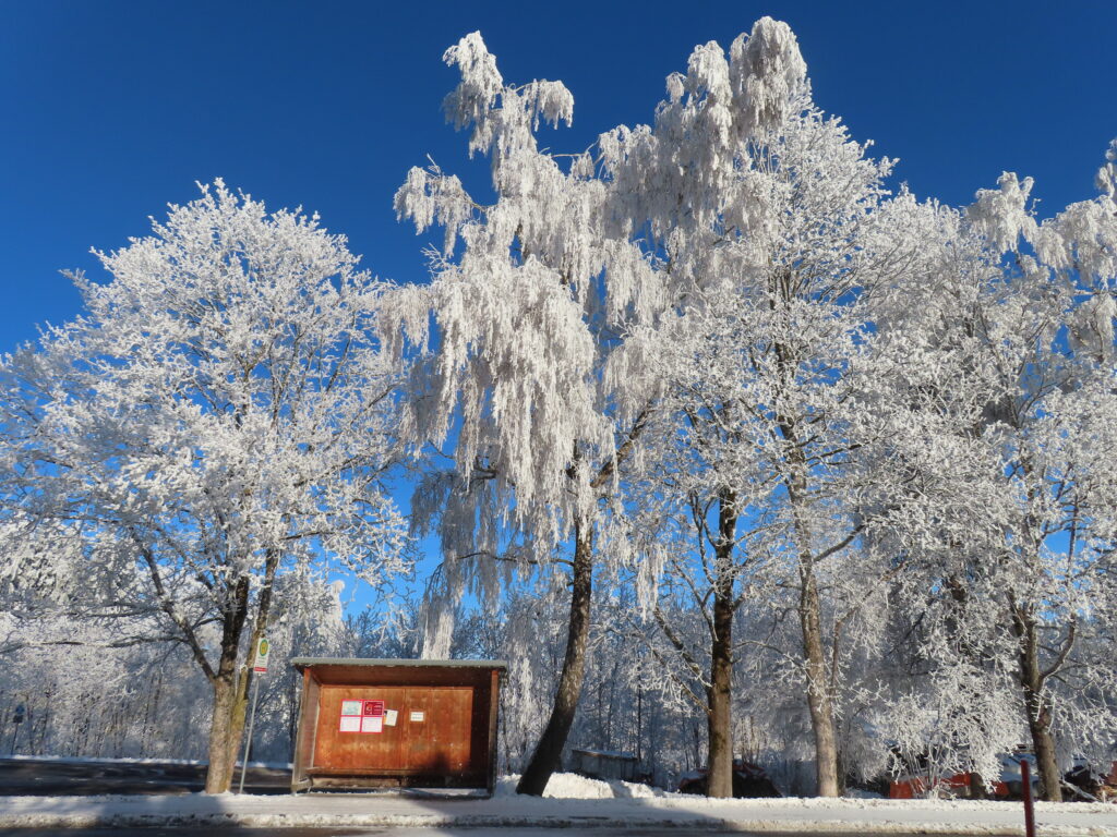 街路樹も見事に凍ってる。雪自体は大して降っていないのだけど、気温が低いから溶けないし、木々に霜がたくさんついてなんとも美しい。それが今陽ざしで少しづつ崩れだし、粉雪のように降りかかる。
