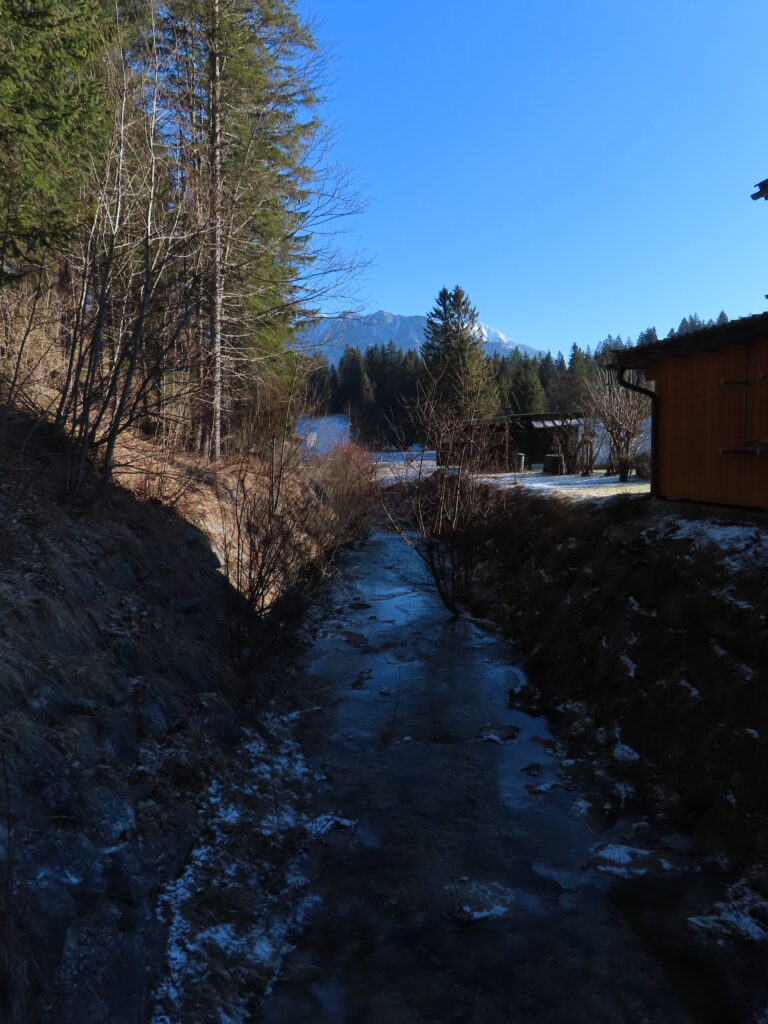 今月の初めに歩いたときは結構雪があったのだけど、今はちょっと悲しい状態。でも気温は低いから地面はしっかり凍っている。